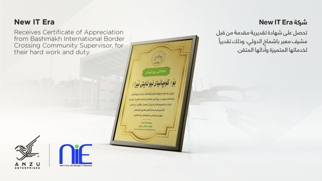 New IT Era, as a member of ANZU Enterprises, was honored to receive a certificate of appreciation from the Bashmakh International Border Crossing Community supervisor. We are proud to be recognized for the outstanding services we have provided and remain committed to the security, health and well-being of our community.